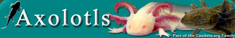 Australians and New Zealanders frequently refer to the Axolotl as the Mexican Walking Fish, though the Axolotl is not a fish but an amphibian, a salamander, part of the order Caudata/Urodela. Because it's a salamander, it's part of one of the three branches of class Amphibia, which also includes the frogs and toads (the Anurans), and the mainly eel-like order, Gymnophiona, which are also known as the Caecilians. Have a look at the Biology Page for a short guide to the Axolotl's body and characteristics. One common misconception is that axolotls and other salamanders are lizards or reptiles. In fact, amphibians are a completely separate group of animals. For example, did you know that reptiles and human beings have a four-chambered heart? Well amphibians have only three chambers. That's just one example of how appearance can be deceiving: salamanders might look like lizards, but they are very different indeed. This page is a brief introduction for those new to the Axolotl and salamanders. If you require specific information, you can search this site using the search facility at the top right of this page. Caudata.org also contains a wealth of axolotl information and it's a great place to buy axolotls or trade with other hobbyists. Caudata.org is the Internet's premier source of salamander and newt information and it places an emphasis on their maintenance in captivity. There is a very busy axolotl forum at Caudata.org, used by people just like you. I hope that you find this site useful, but most of all I hope you enjoy what you read and find here. If you're looking for information about metamorphosed axolotls, click here. ![]() Axolotls of various colours occur in captivity, including grey, shades of brown, leucistic (white with black eyes), golden albino, white albino, as well as other varieties, such as the melanoid (a near-black animal). The normally coloured axolotl, the "wild type", can be near-black like the one in the group photo to the left, chocolate brown like the one in the site's logo, or even creamy in colour, and anywhere in between. There are even "piebald" axolotls in various colours, and a variety that is piebald in more than one colour, known as the "harlequin". You can learn more about how colour comes about and how it is passed on by taking a look at the Genetics Page. And why not take a look at the hundreds of photos of the weird and wonderful varieties of axolotls submitted by enthusiasts like yourself at the Axolotl Section of the Caudata.org User Photo Galleries? The name "Axolotl" comes from the Aztec language, "Nahuatl". One of the most popular translations of the name connects the Axolotl to the god of deformations and death, Xolotl, while the most commonly accepted translation is "water-dog" (from "atl" for water, and "xolotl", which can also mean dog).